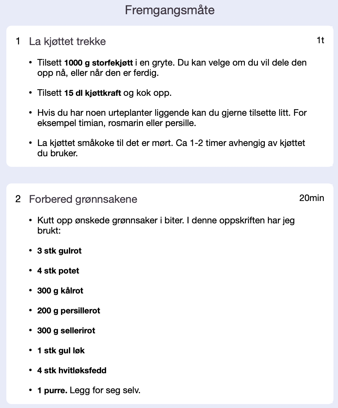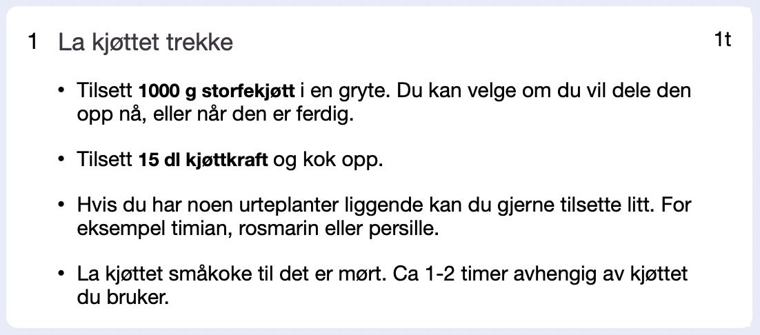 For å løse dette problemet har jeg laget en oppskriftsside der mengden man trenger av en ingrediens også står i fremgangsmåten. Ingrediensene er skrevet i en tykkere skrift slik at det er ekstra enkelt å se. Mengden ingredienser er også dynamisk og endrer seg når man justerer antall porsjoner.