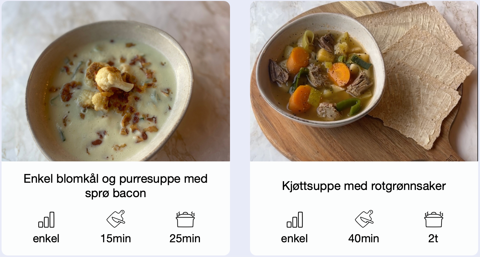 Mange nettsider gir vag informasjon om hvor mye tid det tar å lage en matrett. Foreksempel er det flere som kan bruke tidsrommet 20-40 min. I tillegg er det få som skiller mellom hvor lang tid det tar å lage maten og hvor mye av den tiden som går til tilberedning. Det er stor forskjell mellom en gryte man forbereder i 10 minutter og som må stå i ovnen i et par timer å godgjør seg, og en rett man må tilberede konstant i to timer.